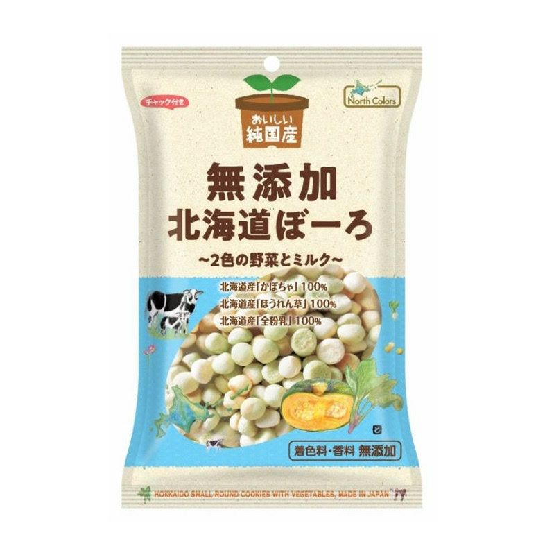原材料名:ばれいしょでん粉(ばれいしょ(北海道産、遺伝子組み換えでない))、てん菜糖(てん菜(北海道産、遺伝子組み換えでない))、水あめ(国内製造)、卵(北海道産)、脱脂粉乳(生乳(北海道産))、全粉乳(生乳(北海道産))、かぼちゃ粉末(かぼちゃ(北海道産))、ほうれん草粉末(ほうれん草(北海道産))