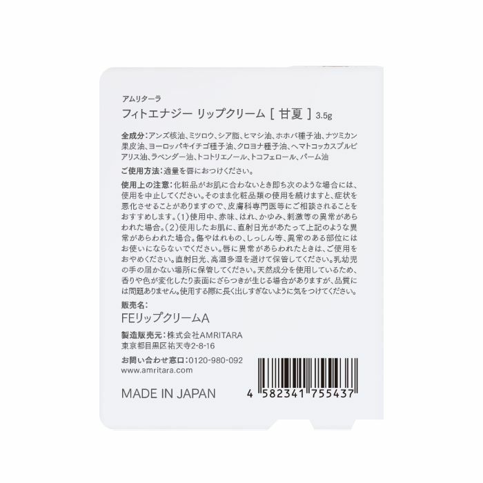 全成分:アンズ核油、ミツロウ、シア脂、ヒマシ油、ホホバ種子油、ナツミカン果皮油、ヨーロッパキイチゴ種子油、クロヨナ種子油、ヘマトコッカスプルビアリス油、ラベンダー油、トコトリエノール、トコフェロール、パーム油