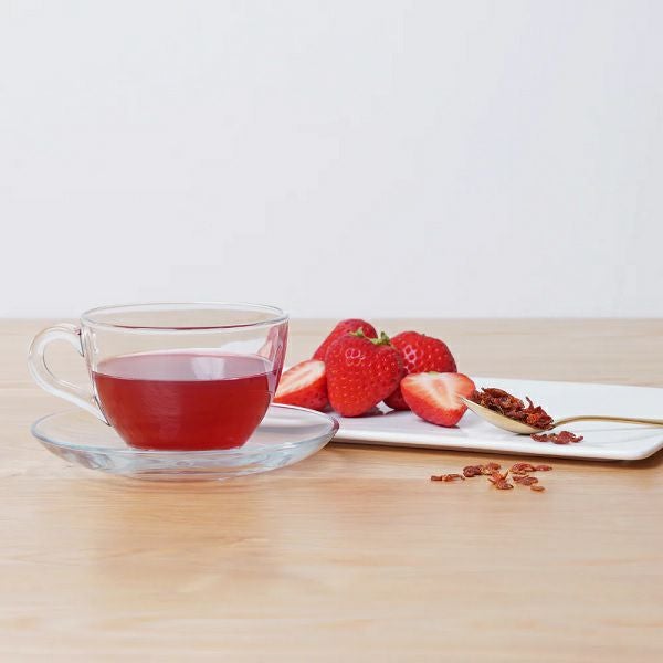 ローズヒップとハイビスカス配合の甘さと酸味のバランスがちょうどよい、いちごの香りのハーブティー。