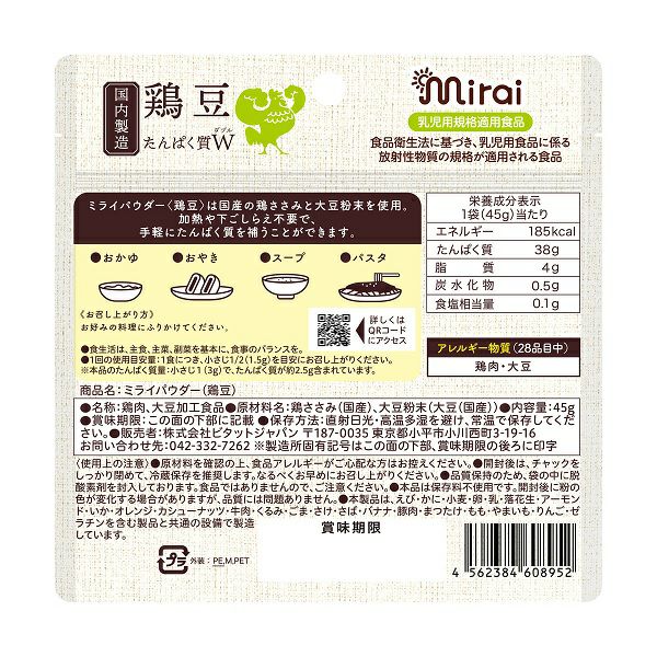 ミライパウダー〈鶏豆〉は国産の鶏ささみと大豆粉末を使用。加熱や下ごしらえ不要で、手軽にたんぱく質を補うことができます。生後7ヶ月頃から。