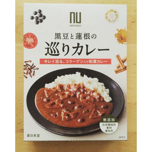 薬日本堂が作るカレー。キレイに嬉しいコラーゲン入り。黒豆とシャキシャキ蓮根を、和漢食材と数種類のスパイスでじっくり煮込みました。黒豆のまろやかな甘みとトマトの酸味がスパイスの香りを引き立てるカレーです。化学調味料、合成香料、着色料、保存料無添加で、安心してお召し上がり頂けます。手軽なレトルト保存食として、家事や仕事で忙しい時に、防災保存食、備蓄食に。