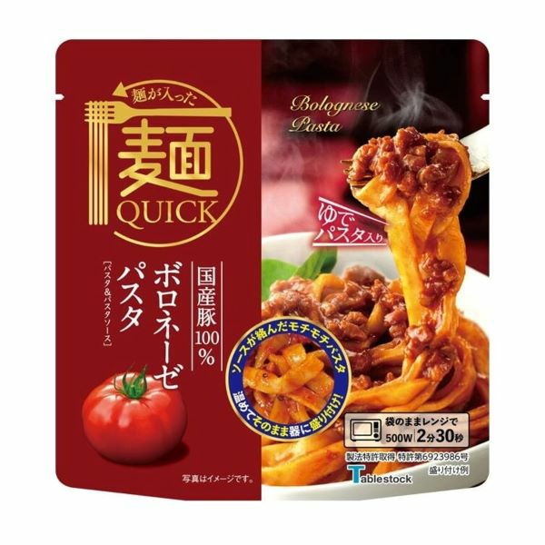 原材料名:めん(小麦粉、食塩、小麦たん白、卵白粉)(国内製造)、でん粉分解物、トマトペースト、豚肉、植物油脂(オリーブ油、菜種油)、玉ねぎ、砂糖、香味油、食塩、ワイン、乳等を主要原料とする食品、野菜ブイヨンパウダー、玉ねぎ加工品、ブラックペッパー、ナツメグ/加工でんぷん、調味料(アミノ酸等)、クエン酸、(一部に小麦・卵・乳成分・大豆・鶏肉・豚肉を含む)