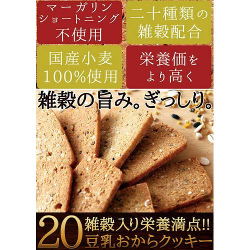 雑穀の旨みがぎっしりの豆乳おからクッキー。美容健康に大注目の雑穀を20種類(赤米、アマランサス、あわ、大麦、キヌア、きび、黒米、黒大豆、玄米、玄麦、ごま、白麦、大豆、高きび、発芽玄米、はと麦、ひえ、もち米、米粉、白ごま)も配合。マーガリン ショートニング不使用。国産小麦100%使用。クッキー1枚あたり約31カロリーです。