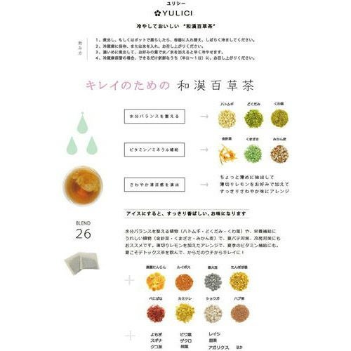 他の画像を見る キレイに嬉しい26種の和漢植物配合のフレンドティー。無漂白ティーバッグ。 YULICI(ユリシー)キレイのための和漢百草茶200g(5g×40袋)/ノンカフェイン カートに入れる お気に入りに登録する 5.00 (2) 当店特別価格 ¥ 2,675 税込