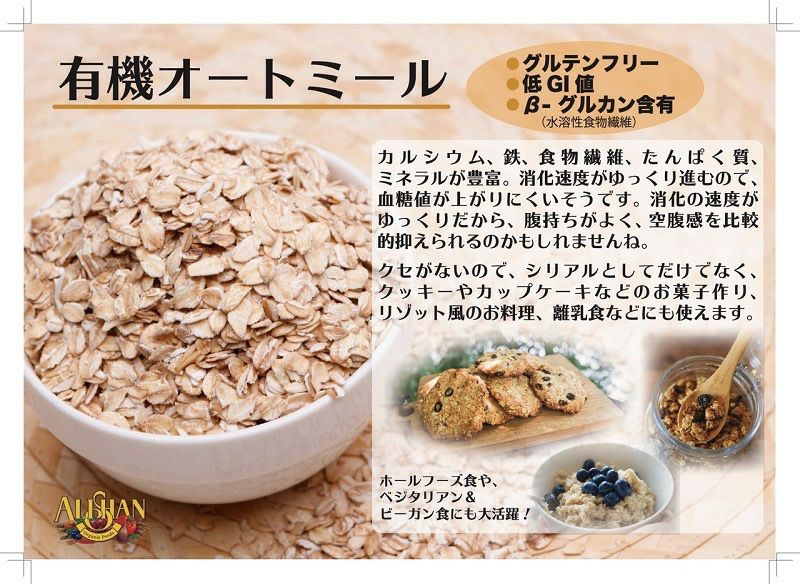 オートミールは、全粒オーツ麦(えん麦)100%を脱穀した栄養バランスの取れたホールフードです。粒が大きく、しっかりしていると評判のアリサンオートミールは、創業当初からの人気商品です。