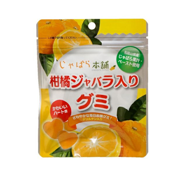 完熟じゃばら果汁7%、完熟じゃばらペースト3%の計10%じゃばらを配合した、コロンとかわいいハート型のグミです。ナリルチン入り。噛めば噛むほど広がるジューシー感♪香料を使用せず、じゃばら本来の甘酸っぱいさわやかな風味を生かしました。着色料、保存料を使用していないので、より安心してご賞味頂けます。 お子様にも大変おすすめです。