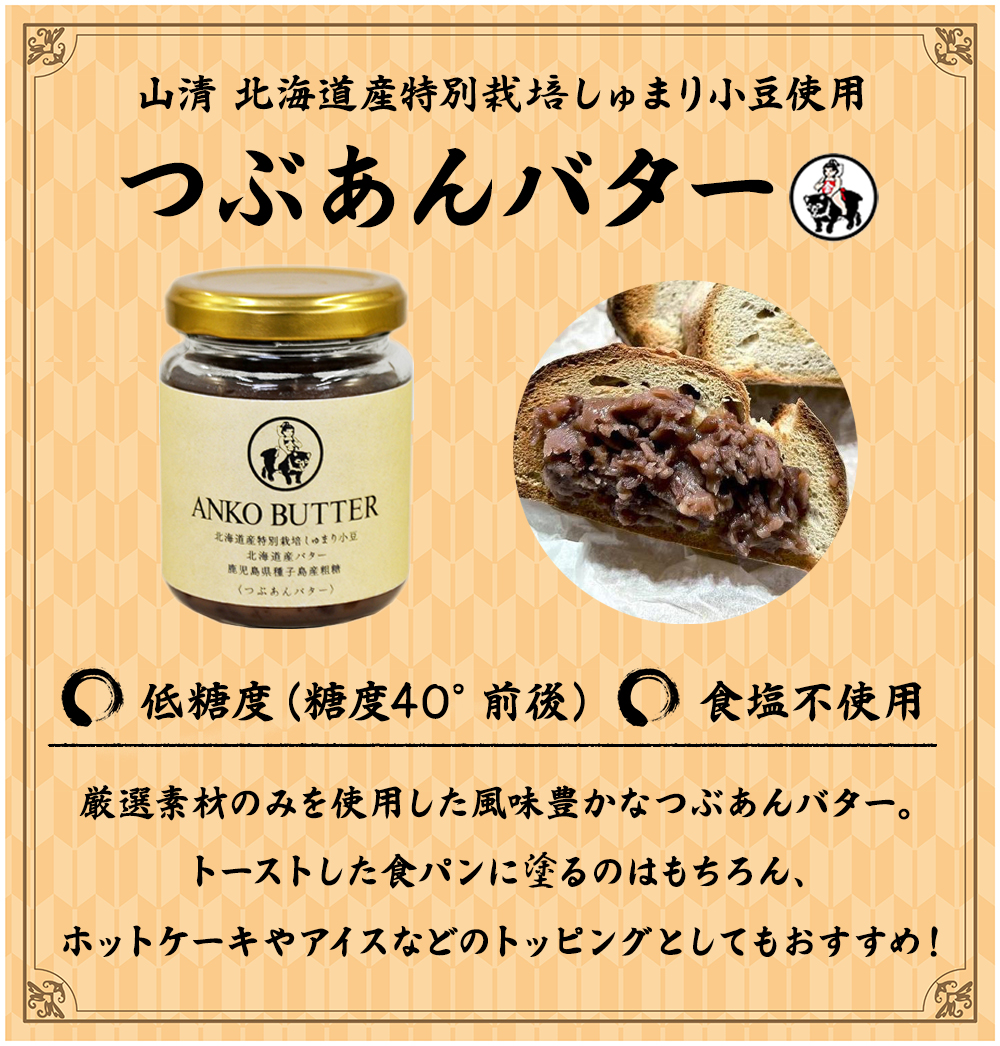 北海道産特別栽培しゅまり小豆、北海道産バター、鹿児島県種子島産粗糖のみを使用した低糖度のつぶあんバターです。