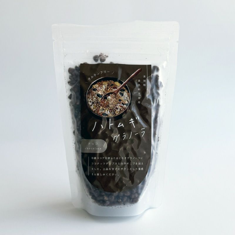 原材料名:はとむぎ(富山県)、砂糖(甜菜含蜜糖)、有機ココナッツオイル、有機カカオニブ、有機ココアパウダー、有機ココナッツチップス、岩塩