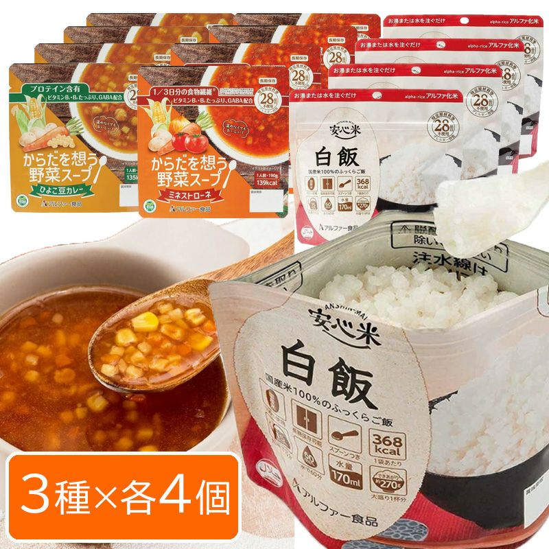 他の画像を見る もしもの時も、からだにやさしい アルファー食品 安心米とからだを想う野菜スープ 3種12個 非常食セット 在庫切れ 再入荷お知らせ お気に入りに登録する (0) 当店特別価格 ¥ 4,147 税込