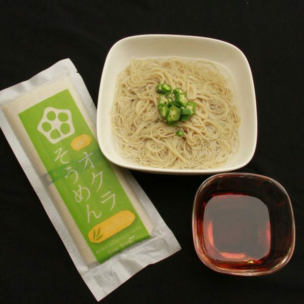 鹿児島県指宿産の採れたてオクラを練りこんだ練りこんだそうめんです。