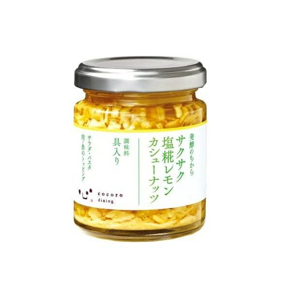 原材料名:なたね油(国内製造)、ローストカシューナッツ、ドライオニオン、フリーズドライ塩糀(塩糀、食塩、難消化性デキストリン)、砂糖、レモン果汁パウダー、食塩、酵母エキス、レモン果皮、レモン果汁、りんご酢/加工でん粉、酸化防止剤(ビタミンE)