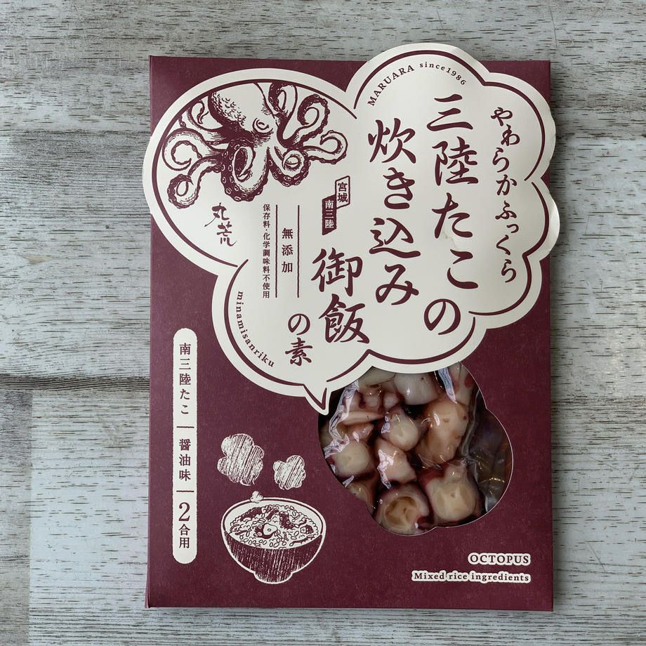 宮城県南三陸産のたこがたっぷりと入った炊き込みご飯の素です。