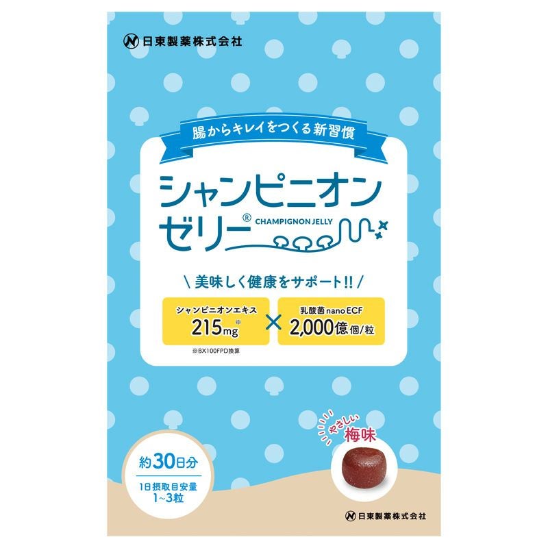 シャンピニオンゼリーはシャンピニオンエキス、お茶の葉抽出物、梅果汁などに加えて、乳酸菌nanoECF2,000億個とフラクトオリゴ糖を配合しています。