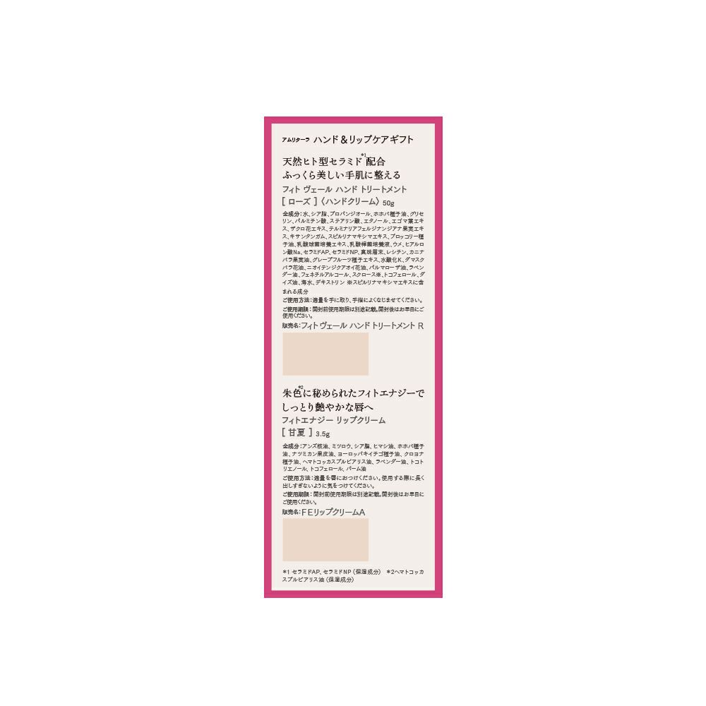 他の画像を見る おすすめ 販売期間 2025/11/01 10:00 〜 手肌と唇にうるおいと美しさを宿すセット。ギフトにもおすすめ amritara アムリターラ ハンド&リップケアギフト 50g+3.5g カートに入れる お気に入りに登録する (0) 当店特別価格 ¥ 4,180 税込