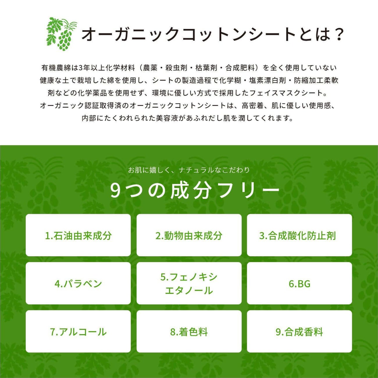 有機農綿は3年以上化学材料(農薬・殺虫剤・枯葉剤・合成肥料)を全く使用していない健康な土で栽培した綿を使用し、シートの製造過程で化学糊・塩素漂白剤・防縮加工柔軟剤などの化学薬品を使用せず、環境に優しい方式で採用したフェイスマスクシート。