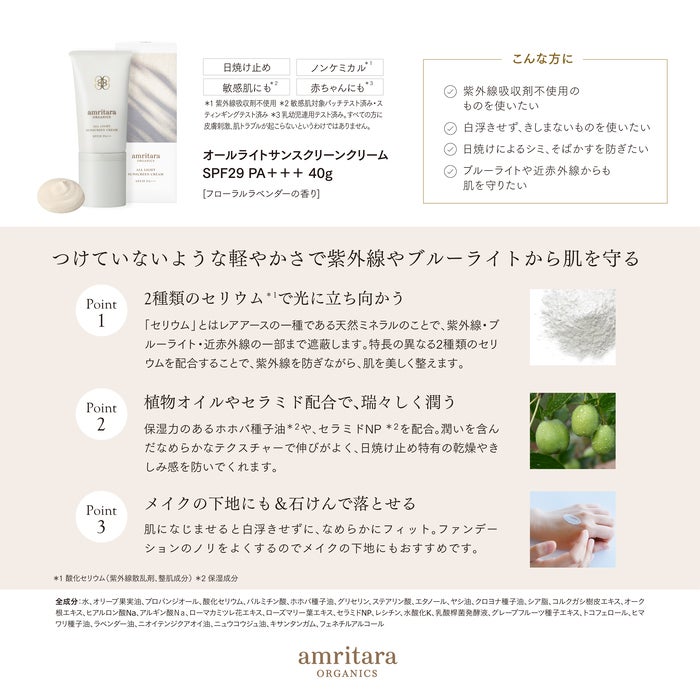 肌に極力負担をかけずに、でも確実に効果のあるものを開発してきたアムリターラの代表作である日焼け止めクリームがパワーアップして、リニューアル前よりも高い数値の【SPF29 PA+++】を実現しました。