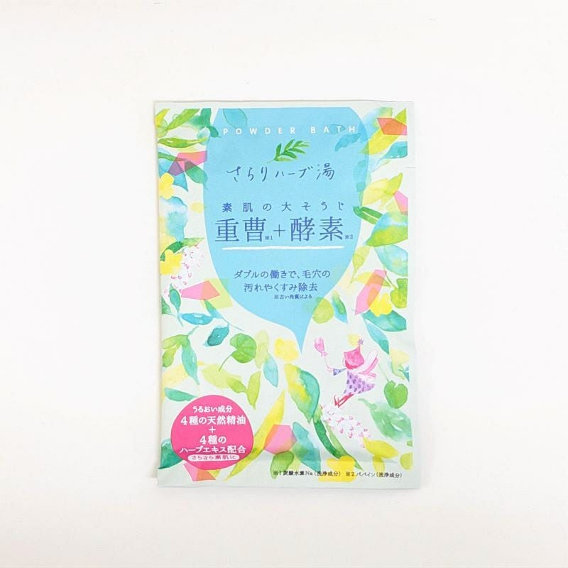 成分:炭酸水素Na、炭酸Na、パパイン、インドレモングラス油、ローズマリー油、月見草油、ティーツリー油、チャ葉エキス、セイヨウハッカ葉エキス、セージ葉エキス、ゲットウ葉エキス、テレビン油、ミネラルオイル、ポリソルベート80、デキストリン、エタノール、BG、水、ケイ酸Ca、香料、黄4、青1