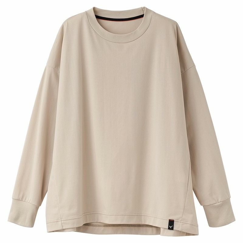 前後差をつけた女性らしいAラインシルエットのロングスリーブTシャツは、ネックと袖口にフライスリブを付けメリハリあるデザインに。また、脇ハギを前方に寄せ、縫目の肌当たりを軽減するリカバリー仕様にしました。