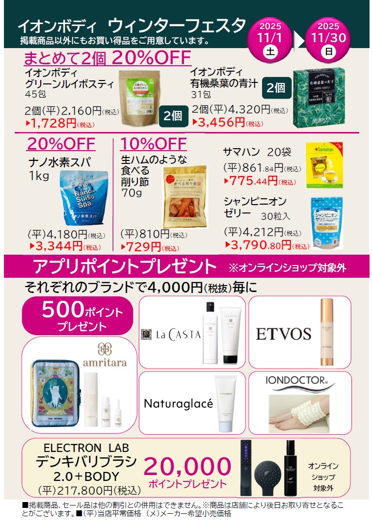 11月1日(土)から11月30日(日)までウィンターフェスタがスタートします!ラインナップをチェック! 一部商品はオンラインでもご注文いただけます。 ⇒チラシでチェック!(PDF) ⇒PDFが閲覧できない方はこちらから |
